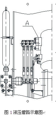 圖1所示為液壓缸與蓄能器間的連接管路,為實現蓄能器對液壓缸快速補壓緩沖作用,A處設計較大直徑管道接口,圖1中A處的原密封形式詳見圖2。圖2中的分油管一端連接高壓膠管,另一端焊接法蘭1,法蘭1與液壓缸法蘭采用螺栓連接,兩法蘭是采用一道端面O型圈(圖2中密封處1)實現密封。