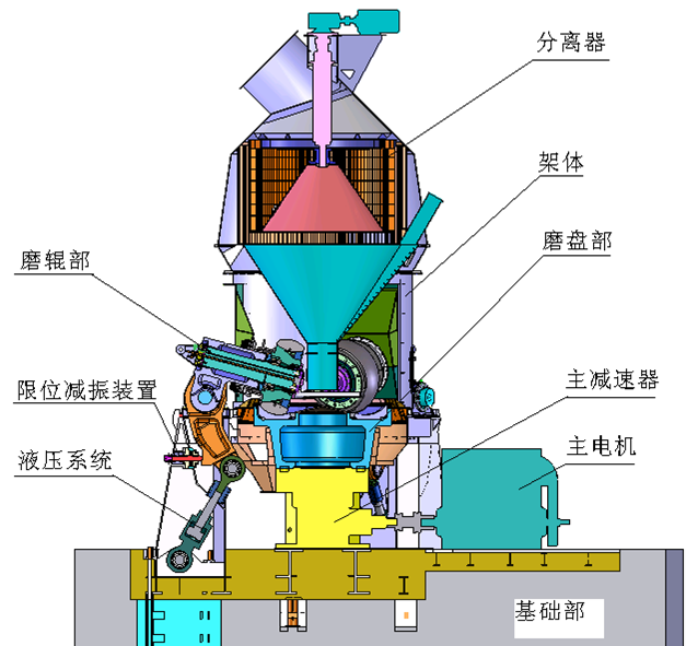 煤制活性炭立磨主要有選粉機(jī)、磨輥裝置、磨盤裝置、加壓裝置、減速機(jī)、電動(dòng)機(jī)、殼體等部分組成。分離器是一種高效、節(jié)能的選粉裝置,磨輥是用來對(duì)物料進(jìn)行碾壓粉碎的部件,磨盤固定在減速機(jī)的輸出軸上,是磨輥碾壓物料的地方,加壓裝置是為磨輥提供碾壓力的部件,向磨輥提供足夠的壓力以粉碎物料。