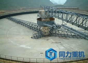 濃縮機一般主要由濃縮池、粑架、傳動裝置、粑架提升裝置、給料裝置、卸料裝置和信號安全裝置等組成。工作的主要特點是在待濃縮的礦漿中添加一定量的絮凝劑,使礦漿中的礦粒形成絮團,加快其沉降速度,進而達到提高濃縮效率的目的。