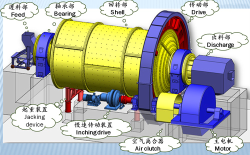 溢流型球磨機主要由筒體、端蓋、主軸承、中空軸頸、傳動齒輪和給礦器等部分組成。溢流型球磨機為臥式筒形旋轉裝置,外沿齒輪傳動,兩倉,格子型球磨機。物料由進料裝置經(jīng)入料中空軸螺旋均勻地進入磨機第一倉,該倉內(nèi)有階梯襯板或波紋襯板,內(nèi)裝不同規(guī)格鋼球,筒體轉動產(chǎn)生離心力將鋼球帶到一定高度后落下,對物料產(chǎn)生重擊和研磨作用。物料在第一倉達到粗磨后,經(jīng)單層隔倉板進入第二倉,該倉內(nèi)鑲有平襯板,內(nèi)有鋼球,將物料進一步研磨。粉狀物通過卸料箅板排出,完成粉磨作業(yè)。