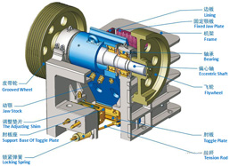 鄂式破碎機工作時,活動鄂板對固定鄂板作周期性的往復運動,時而靠近,時而離開。當靠近時,物料在兩鄂板間受到擠壓、劈裂、沖擊而被破碎;當離開時,已被破碎的物料靠重力作用而從排料口排出。